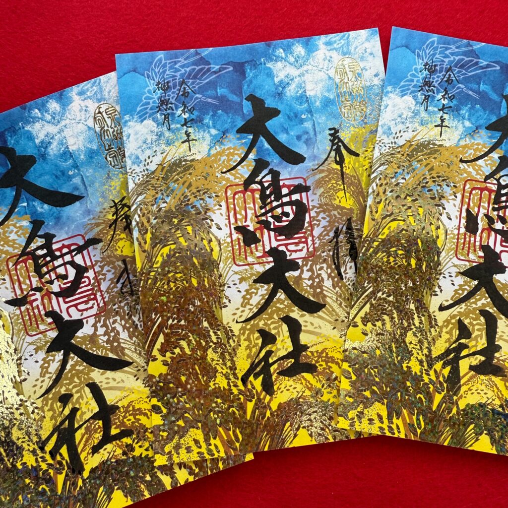 特別限定朱印「大鳥の四季」は月ごとに季節の草花を神様にお捧げする特別なご朱印です。毎年十月は「稲」を題材に奉製しております。