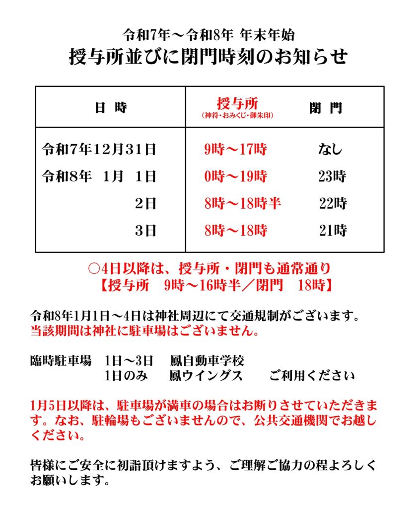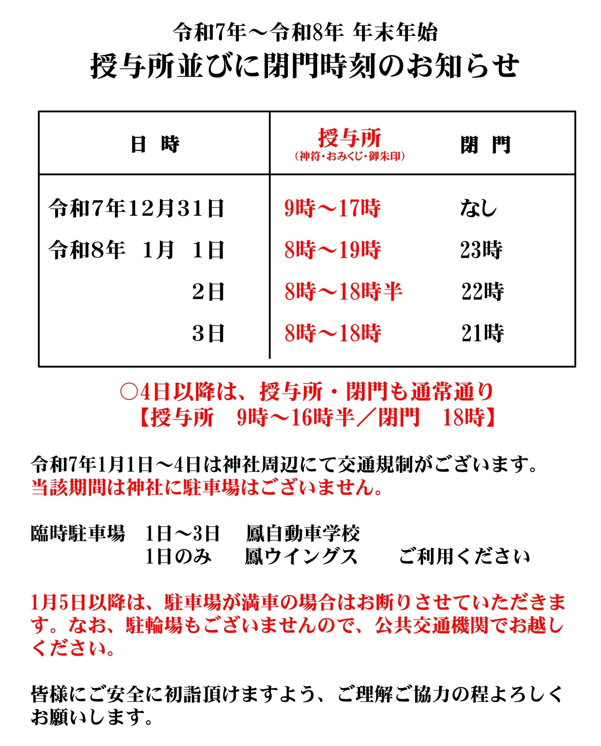 令和8年初詣 授与所並びに閉門時刻のご案内