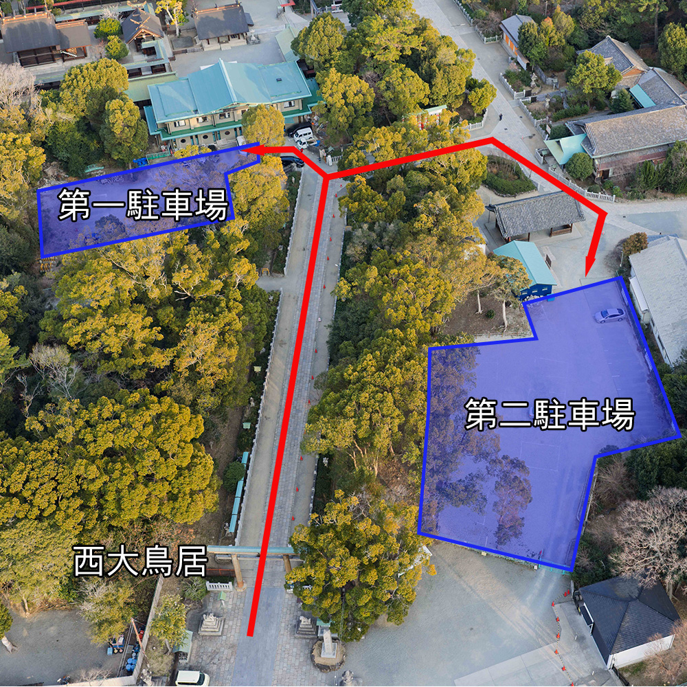 駐車場は西の大鳥居を通って直進してください。